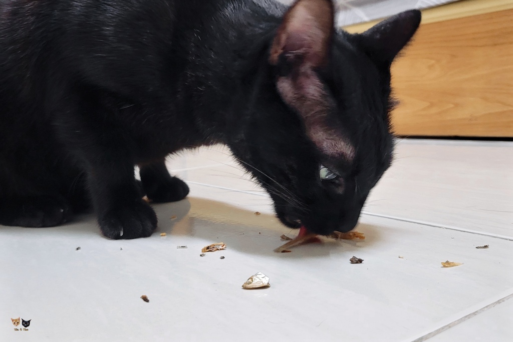 Na哥則喜歡自己吃,不過只會把整尾小魚乾沾滿口水