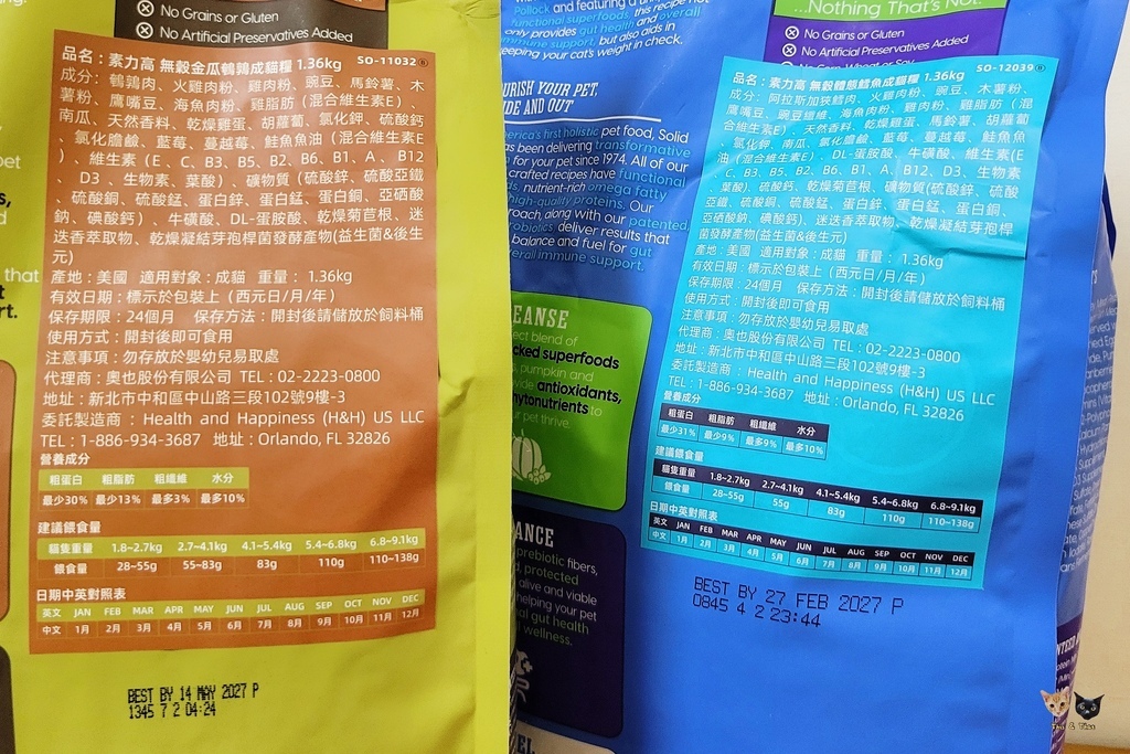 目前貓糧有「放牧鮮雞、深海藍鱈、化毛雞肉、化毛野鮭、體態鱈魚、金瓜鵪鶉、什錦羊肉」口味