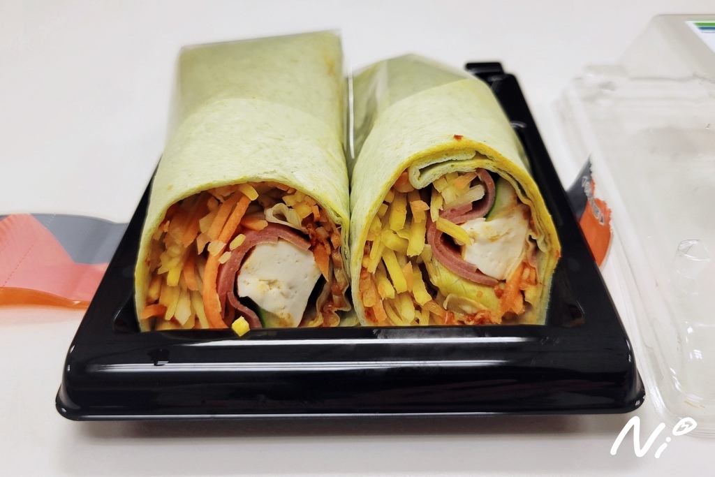 內容:烤板豆腐、火腿片(豬肉產地:台灣)、韓式泡菜、生萵苣葉、胡蘿蔔絲、黃色胡蘿蔔絲、小黃瓜條